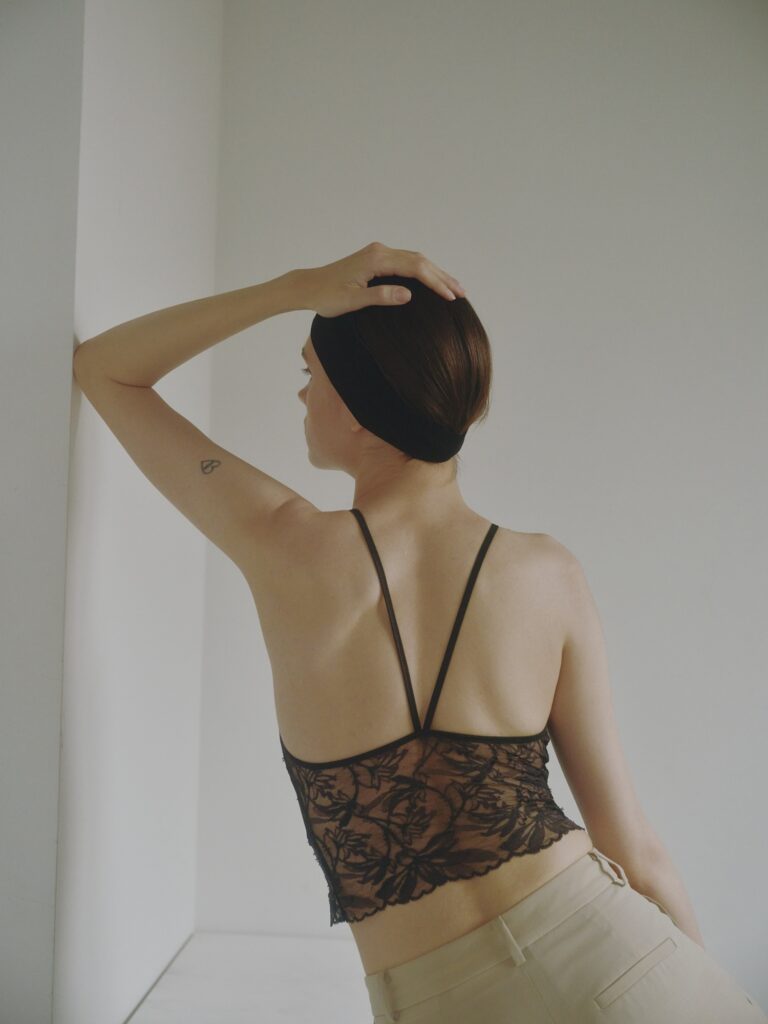 アメリカンスリーブのシルクトップは、肩まわりを大胆に見せるカッティングが印象的。ネックラインはやや詰まり気味に設計し、潔く、凛とした佇まいをつくります。そしてこの一枚を象徴するのが、バックスタイルに大胆に施したリバーレース。背中一面に広がる繊細なレースが、シルクの艶とコントラストを描き、後ろ姿に静かな色気を宿します。甘くなりすぎず、モードでありながら上品。この“背中で魅せる”デザインこそ、AROMATIQUEらしいスタイルです。クロップド丈に仕上げることで、スタイリングの自由度も広がりました。ジャケットを羽織り、ハイウエストのパンツやスカートと合わせれば、ランジェリーの枠を超えた洗練されたバランスに。装いの核となる存在へと広がります。