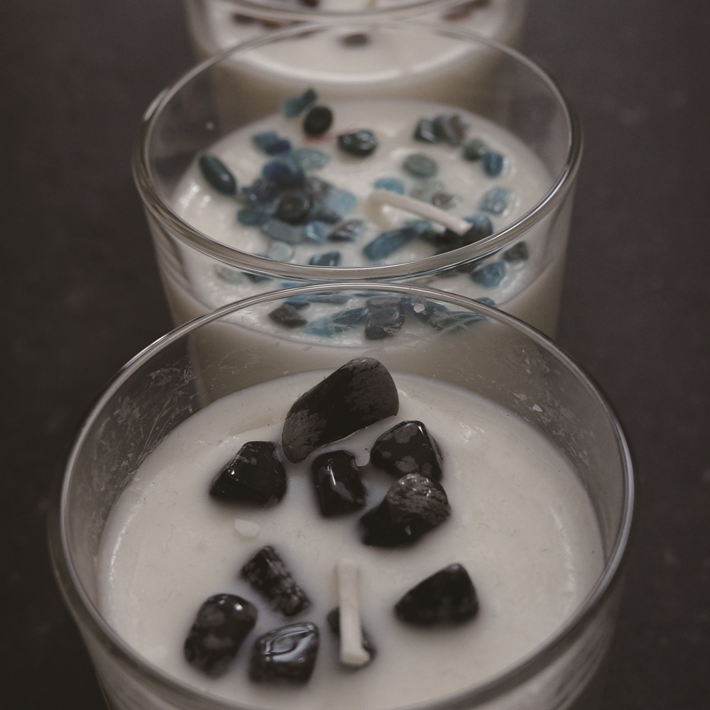 What makes these candles truly unique is the presence of a semi-precious stone embedded within each one—each carrying its own meaning.