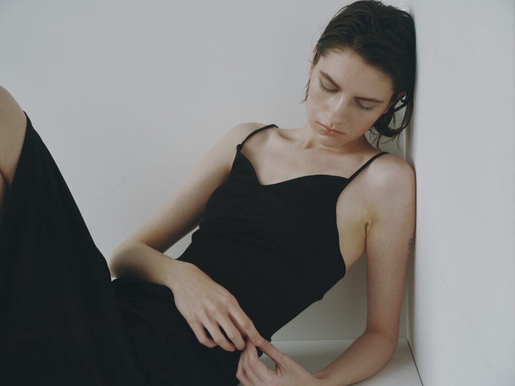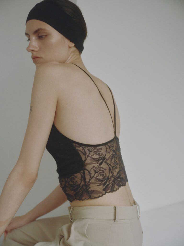 ミニマルでモードな印象をまとうコットンストレッチのブラとボトムス、そしてシンプルで美しいシアートップス。