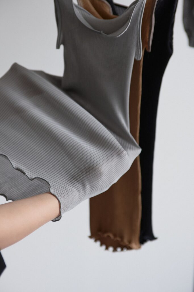 The finished rib knit carries a light, almost sheer quality, paired with a gentle luster. It is a fabric that speaks softly — both to the skin and to the eye.