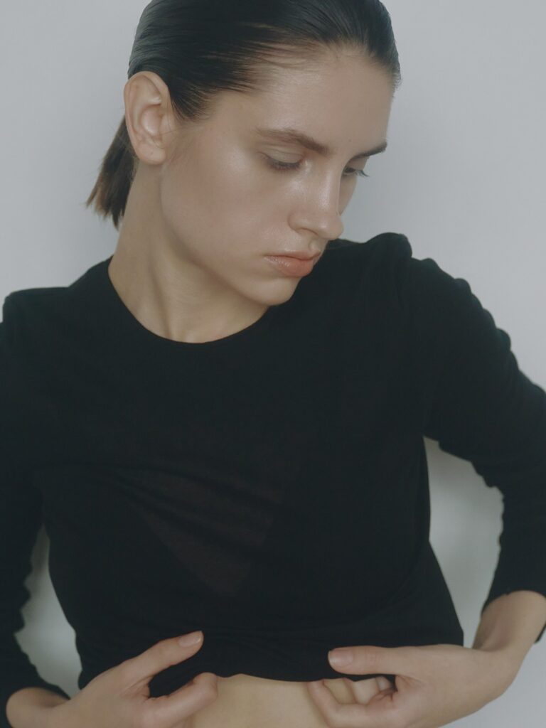 The simplicity of this material is best experienced through the knit top. Designed with minimal detailing, it allows the beauty of the fabric and the delicacy of the silhouette to come forward. It gently follows the body without feeling tight, creating a natural and effortless line. Worn on its own or layered under a jacket, the subtle sheerness adds lightness and dimension to everyday styling.