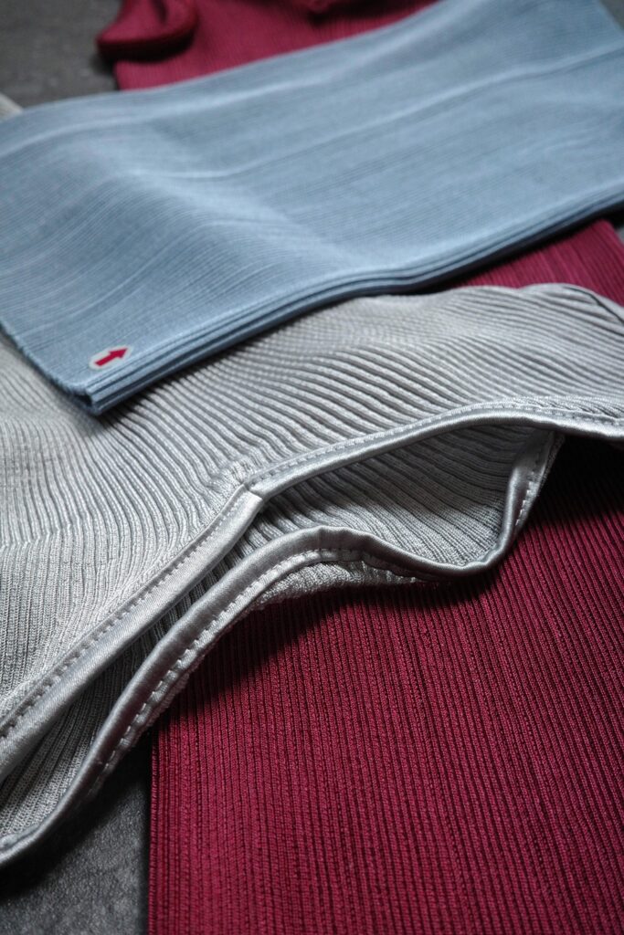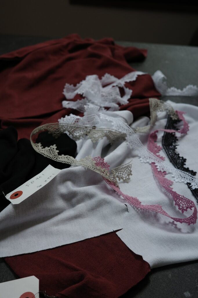イタリアから届く上質な糸、フランスからの繊細なレース、そして日本国内で紡がれる極細の糸。糸は細くなるほど光沢を帯び、ラグジュアリーを纏います。私たちはそれらを時間をかけて編み立て、デザインし、パターンや裁断に至るまで無駄のないよう工夫しながら、ひとつのランジェリーを形にしています。